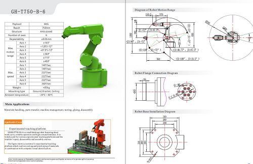 GH-T750-B-6 is our mini General-purpose Series robot arm,can be do 750 mm-2950mm reaching ;widely used for Materials handling, parts transfer, machine management, testing, gluing, &assembly ; with favorable price, wide application, safe and efficient, is a product worth having ,It is a light-weight body with a suitable arm length and a moderate load weight, reaching out to customers